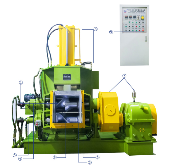 由制动电机,摆线减速机和铜蜗轮结构组成机械翻转,也可选用我公司独家研发,行业领先水平的液压翻转,推动混炼室翻转140度卸料。